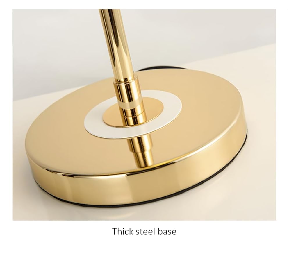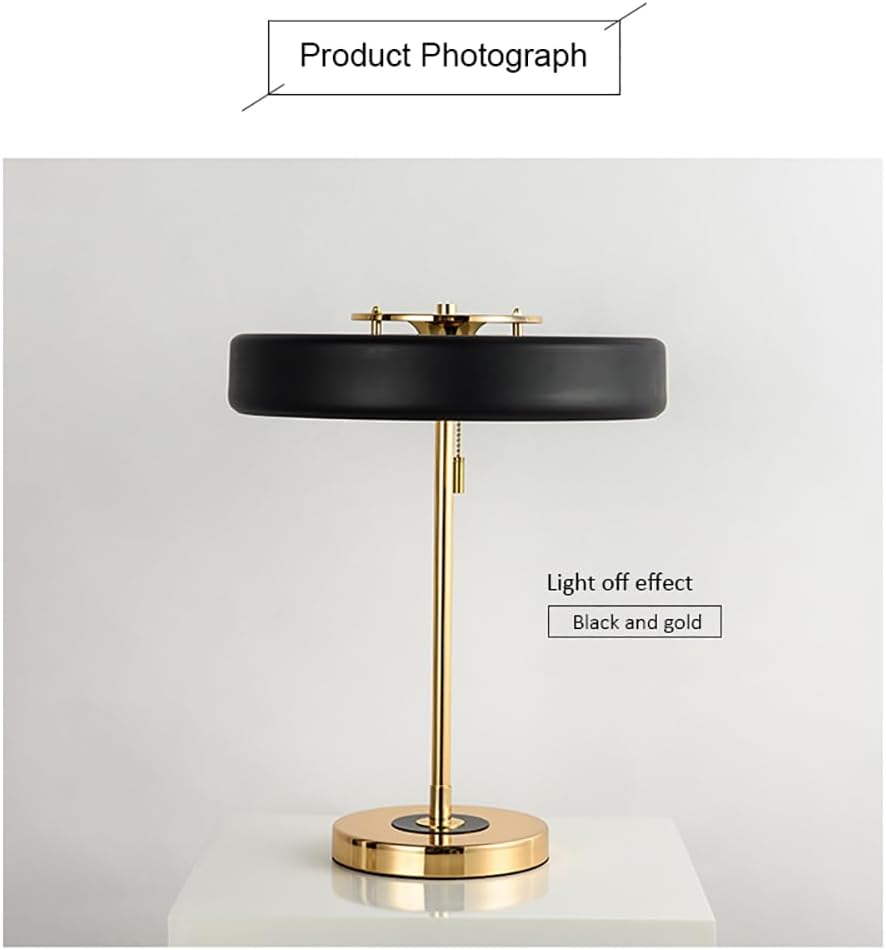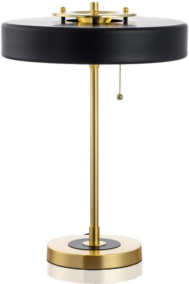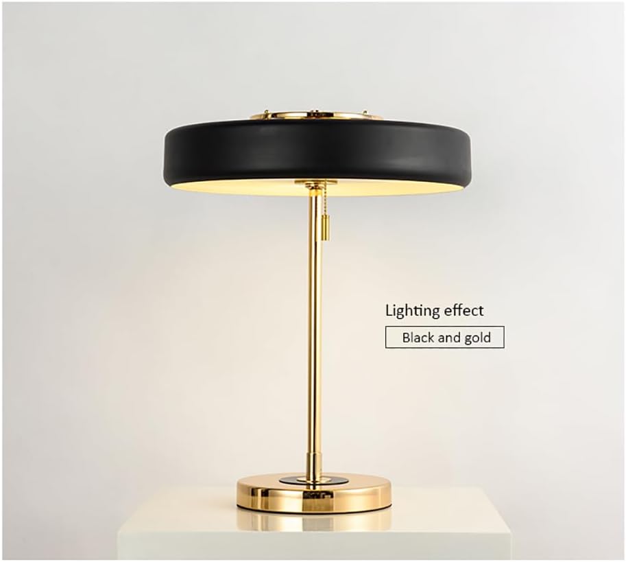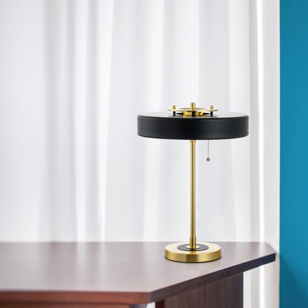 Stijlvolle retro tafellamp met gouden standaard en platte zwarte kap. Voorzien van trekschakelaar. Mid-century modern design dat een statement maakt in elk interieur. Hoogwaardige afwerking met oog voor detail.
