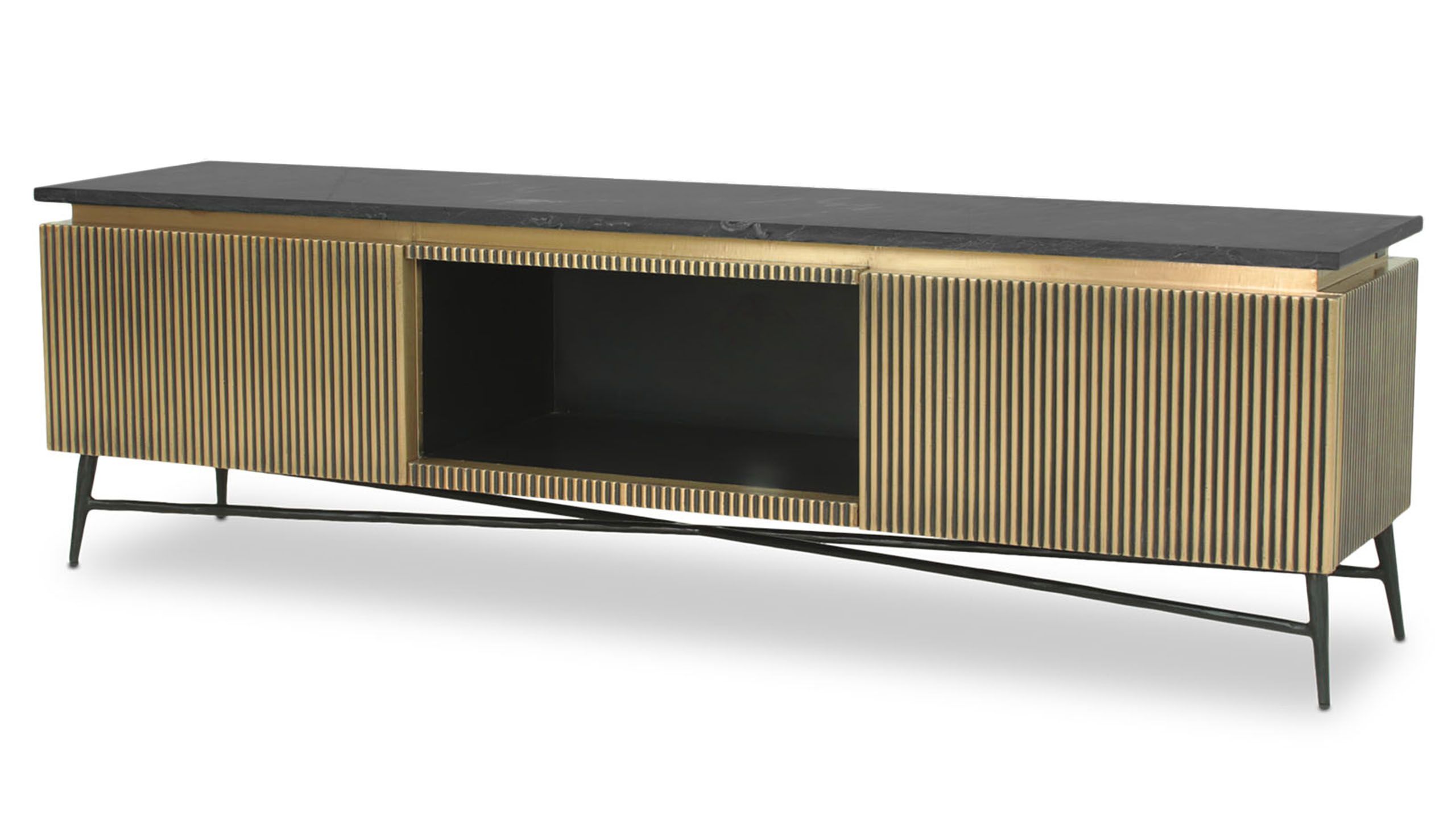 Uniek TV-meubel met jaren ’60 styling en een moderne twist. Gekenmerkt door een strakke vorm en geribbelde textuur in antiek messing. Het tafelblad is gemaakt van marmer, een duurzame steensoort met luxueuze uitstraling.